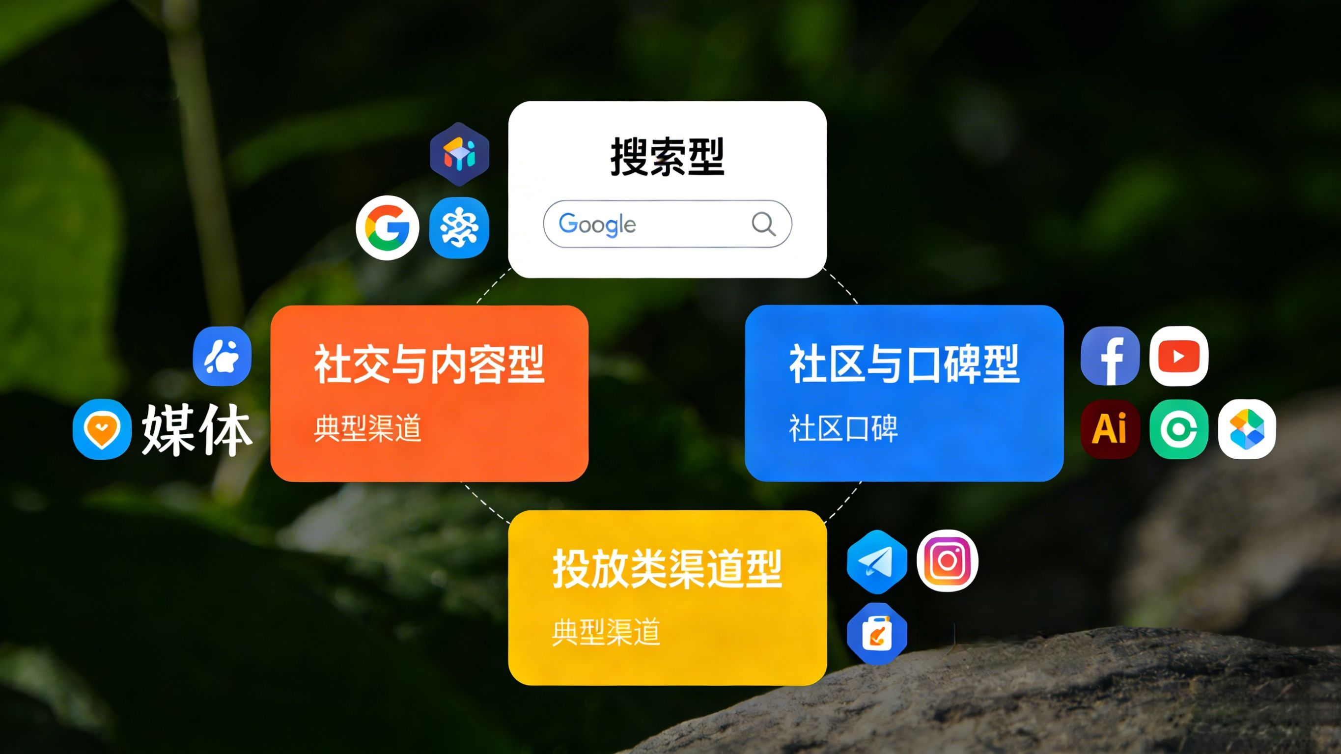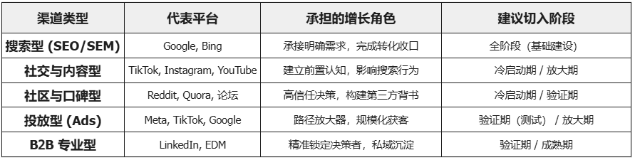 注:渠道的选择并非孤立,关键在于通过搜索型渠道承接社交与内容型渠道带来的流量,形成转化闭环。